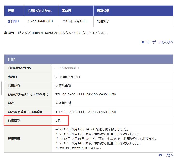 【荷物個数】处显示为2個(或多个),查询显示如下图,。
